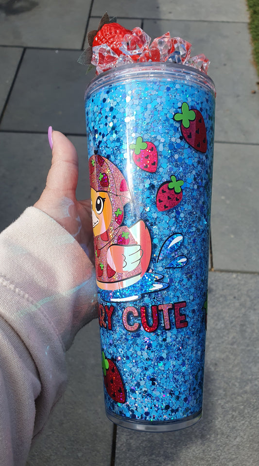 Berry Cute 24oz snow globe tumbler, with faux ice & strawberry lid