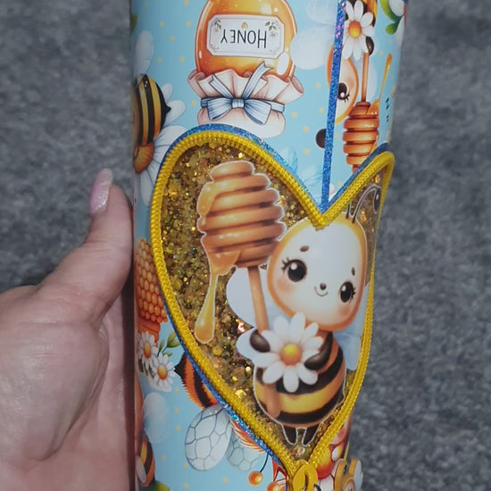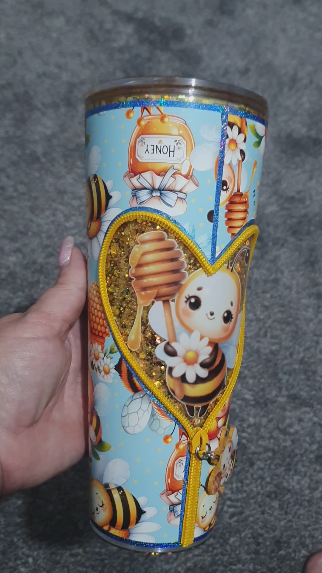 Cute bee zipper kit snowglobe tumbler, thus beautiful tumbler is a 24oz double-walled tumbler filled with a suspended flow glitter solution decorated with printed vinyl, a zipper and uvdtf decal. The lid is glitter with decals covered in resin.