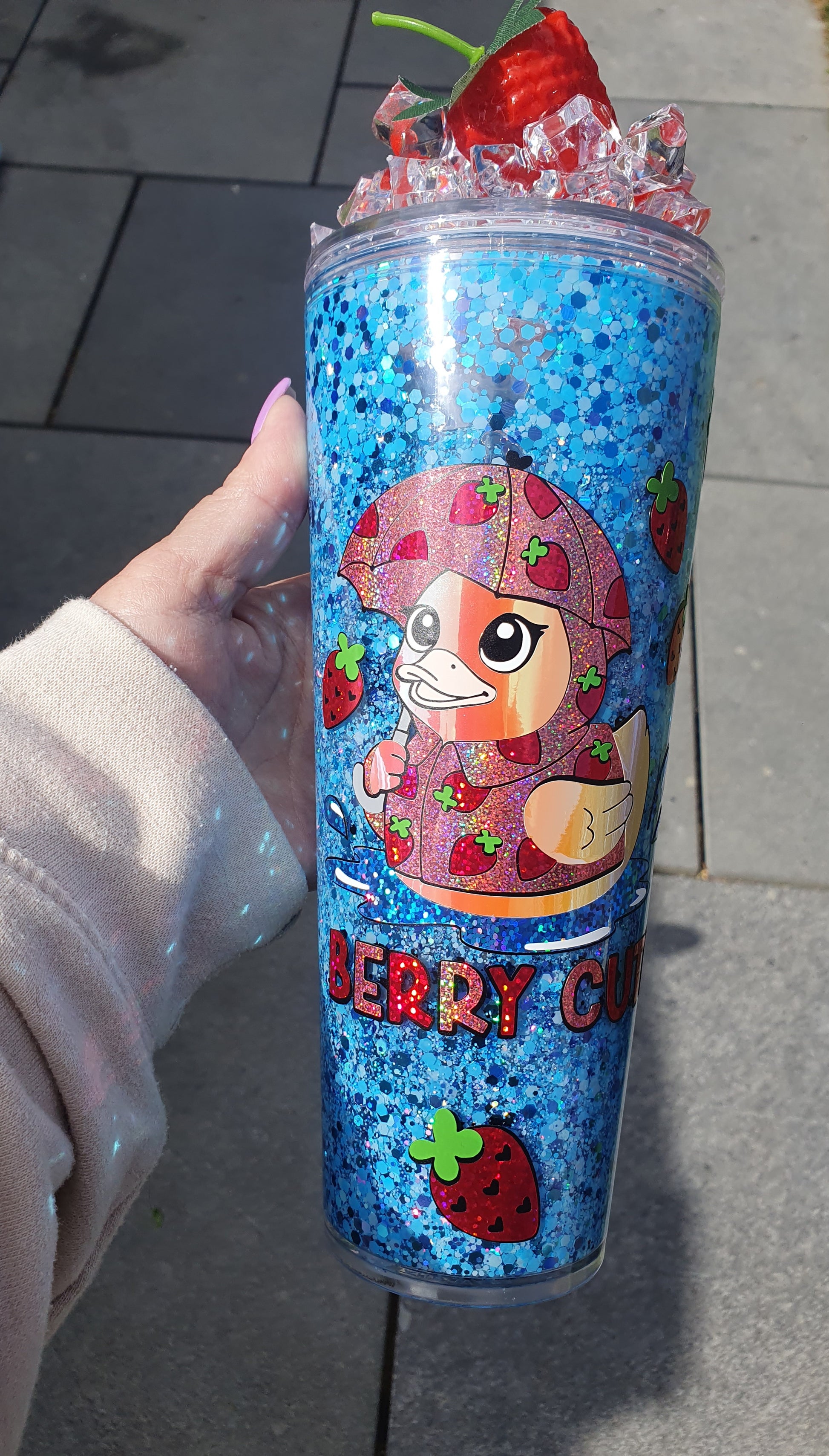 A beautiful 24oz suspended flow snowglobe tumbler with blue glitter, and cute duck and strawberries design in vinyl, the lid is a screw on and is decorated with feux ice and strawberry making this tumbler a great conversation starter wherever you go.