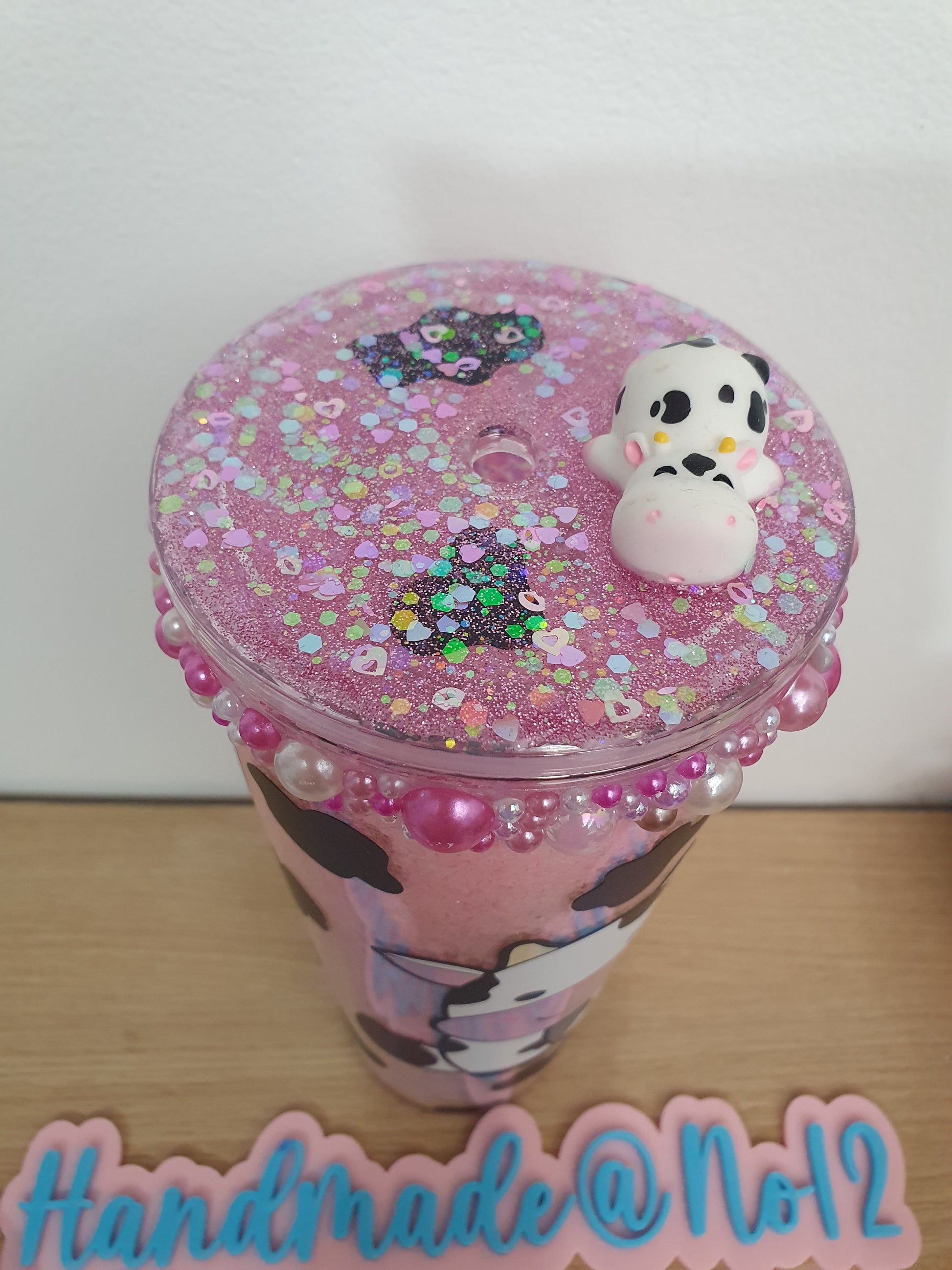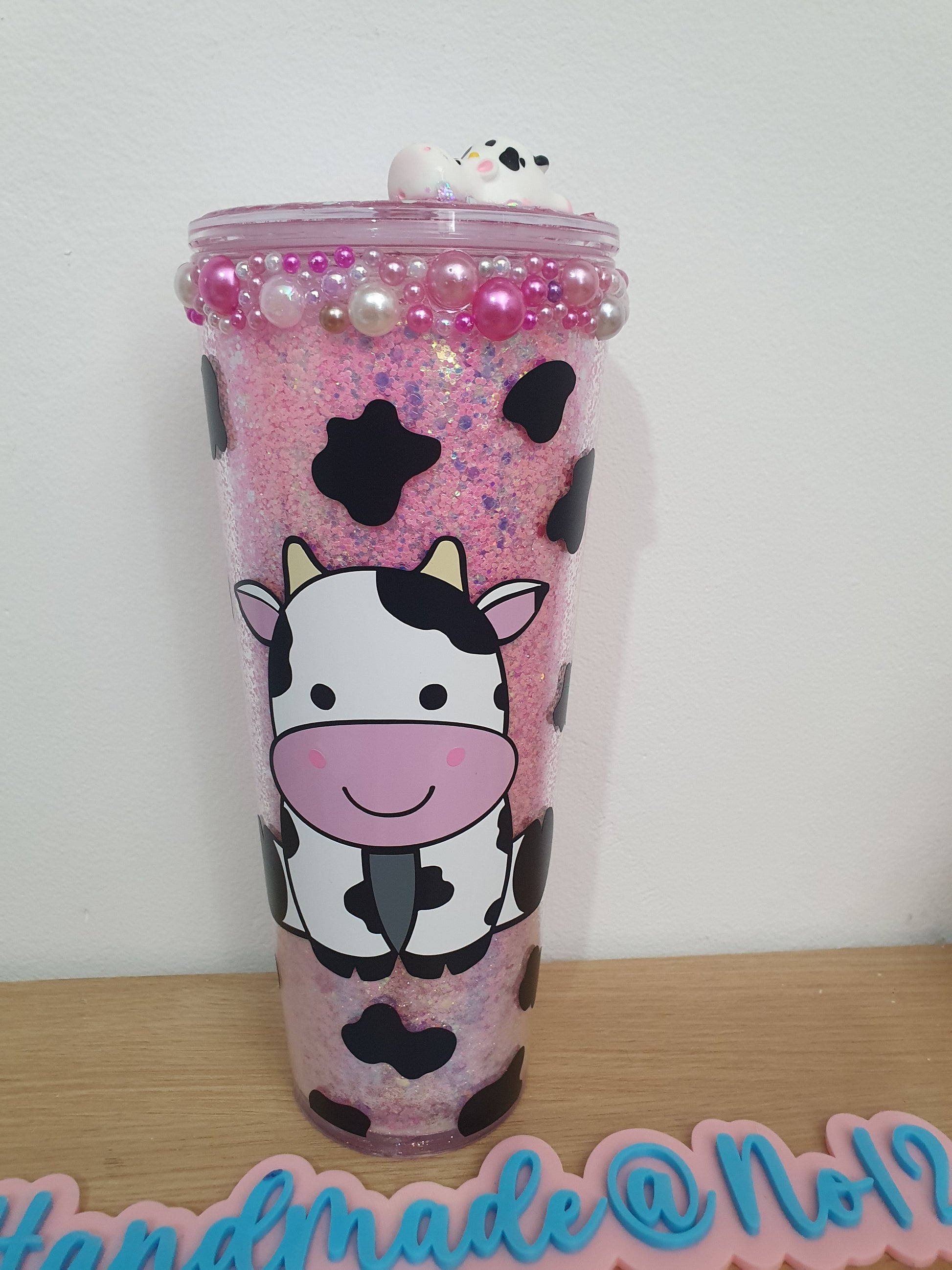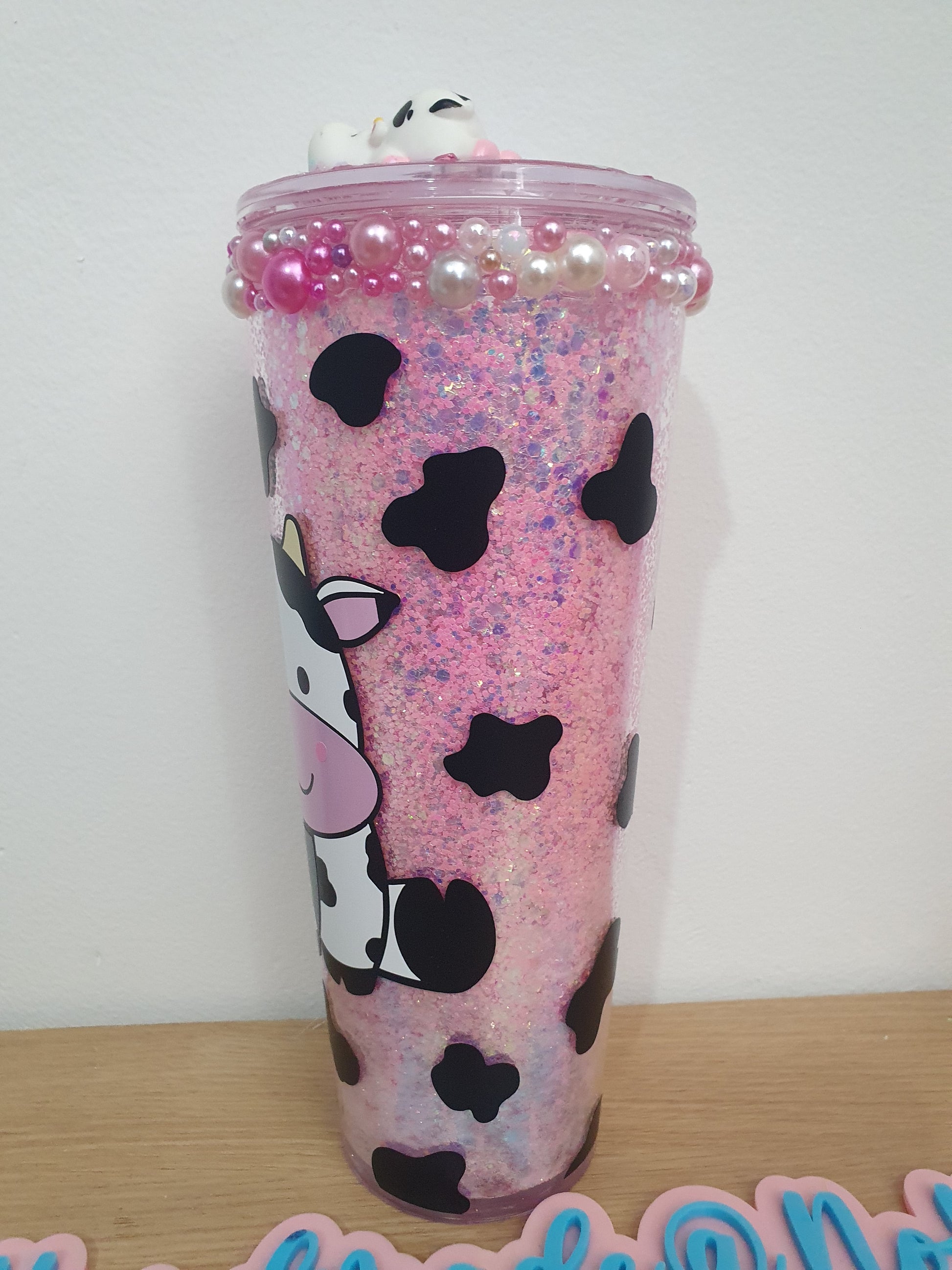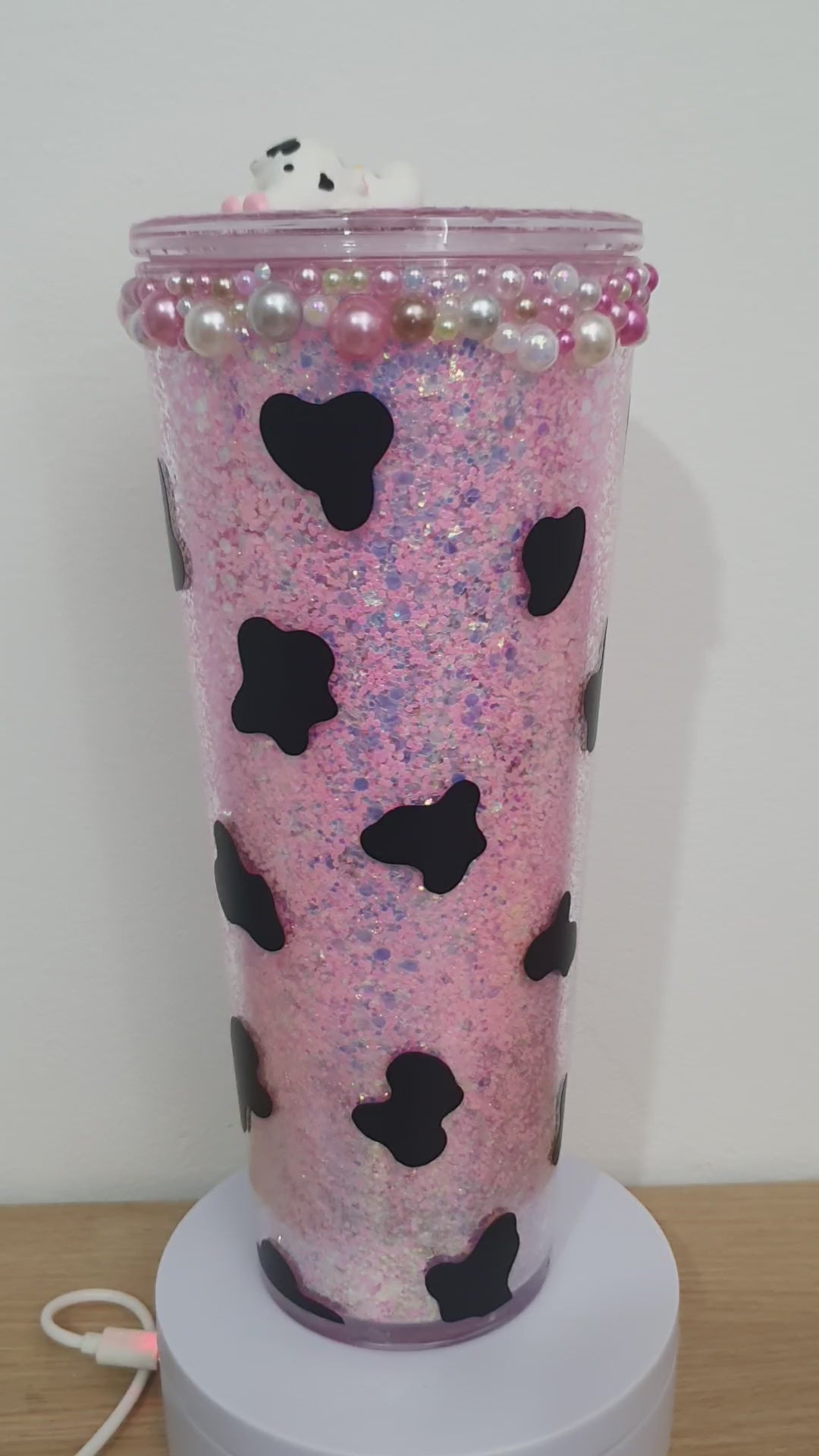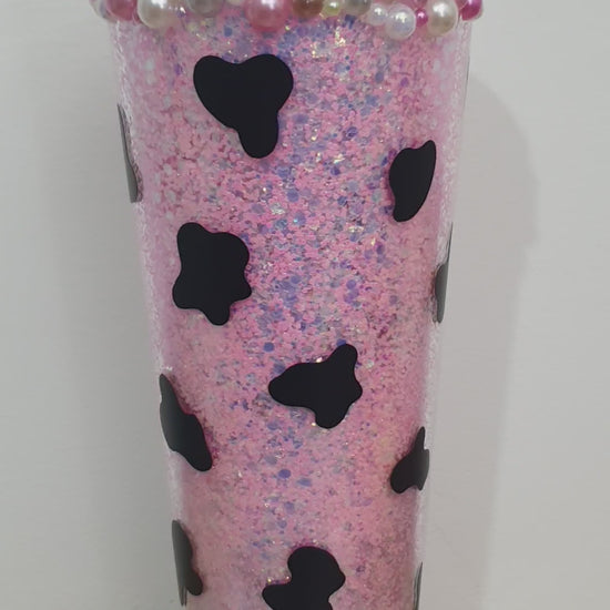 Introducing the Cow Nogloble 24oz Acrylic Drinks Tumbler! This 24oz tumbler features a stunning pink glitter design with a cute cow and cow print design, accented by pearls. Complete with a glitter lid featuring a cow design and a convenient straw for easy sipping. Perfect for quenching your thirst in style!