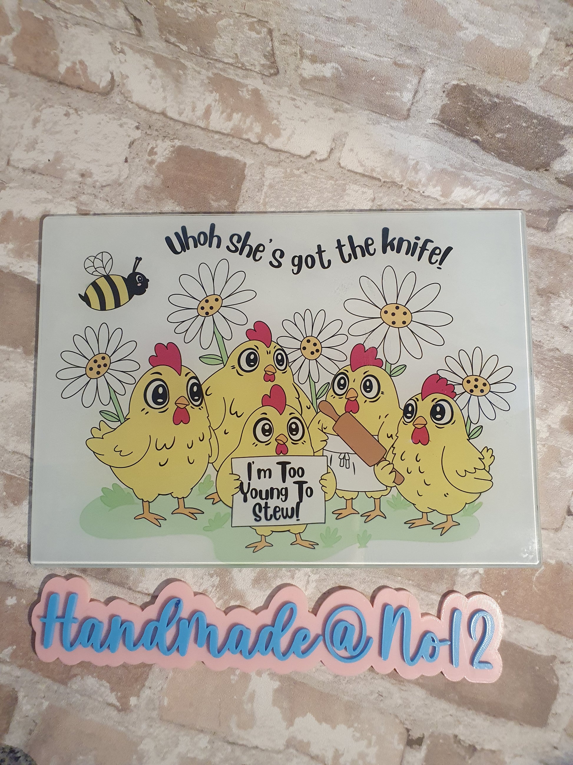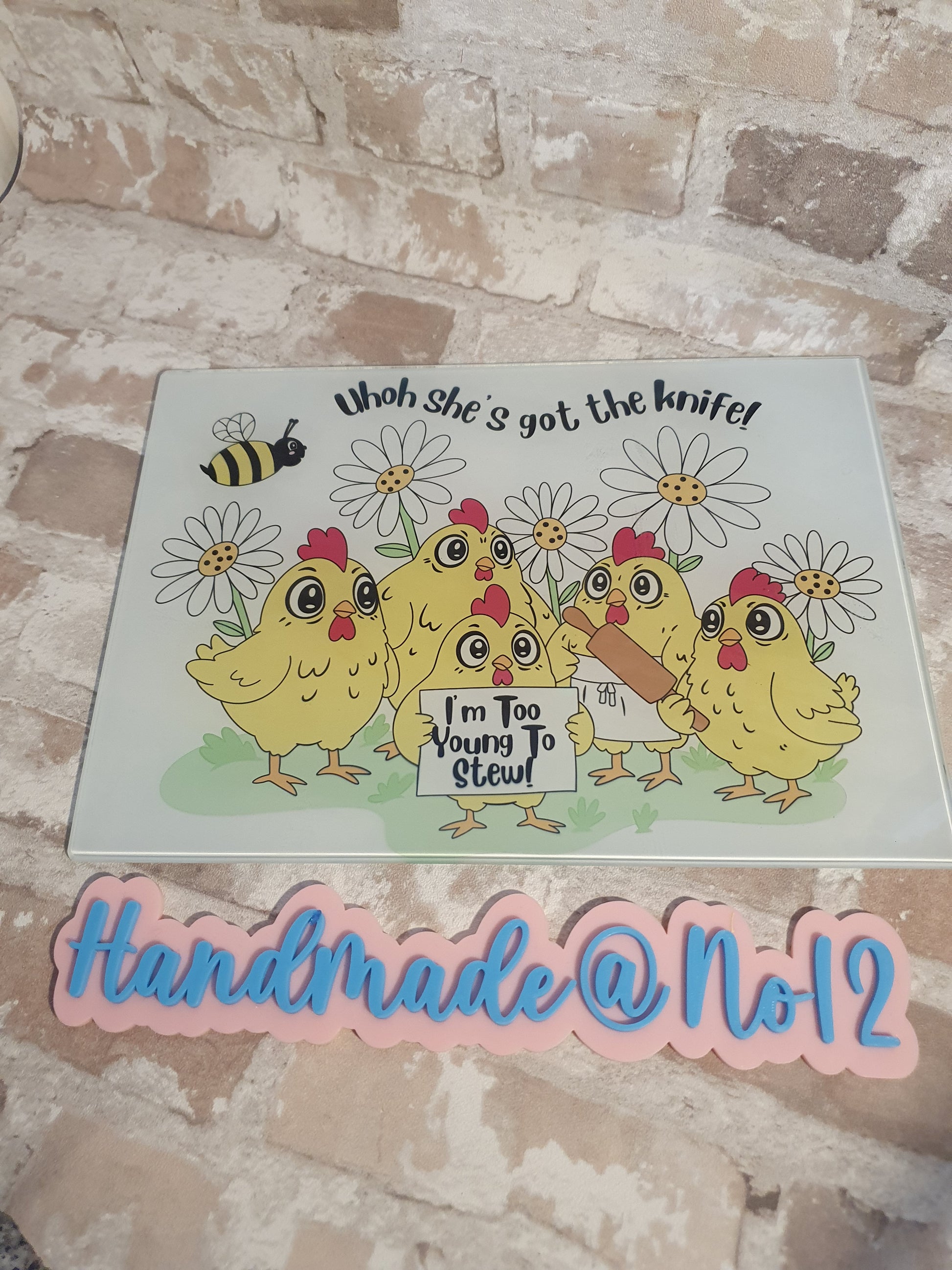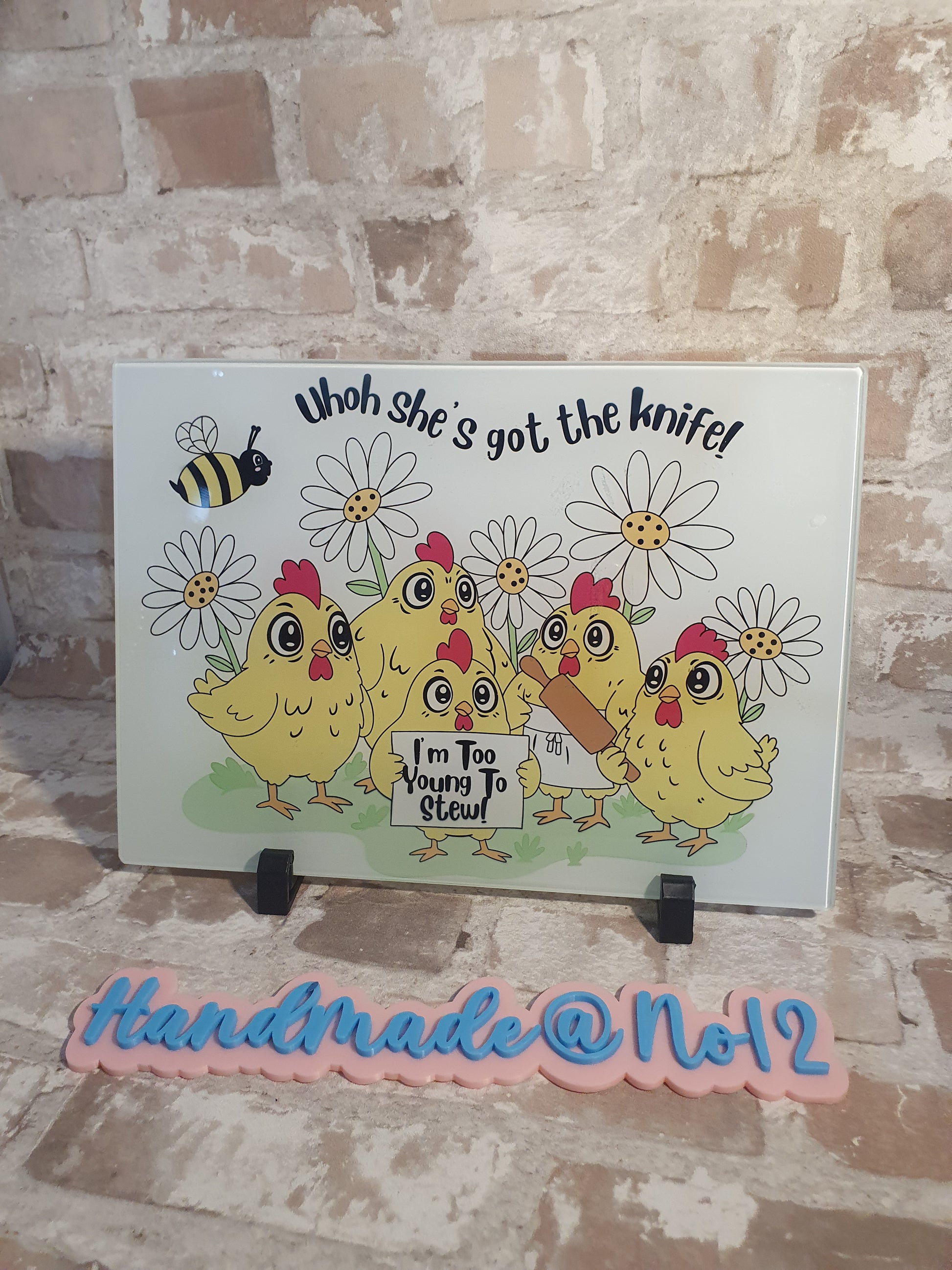 Introducing our A4 size glass chopping board, a great addition to any kitchen. The board is beautifully sublimated with Crazy chicken and quirky saying, making it a unique and fun addition to your kitchen decor. The sublimation process ensures that the image is long-lasting and will not fade or peel off over time.